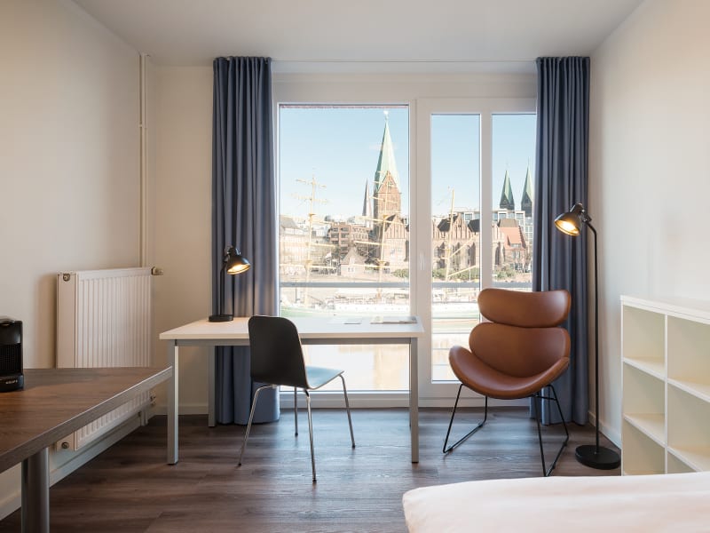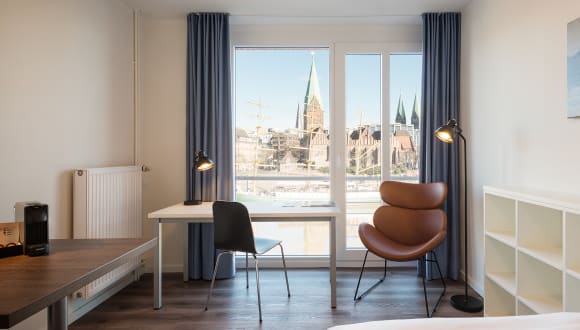 Alle 30 voll möblierten Apartments bieten auf 21-34 qm einen einzigartigen Ausblick über die Weser und Schlachte bis zum Dom. Die 24 Ein-Raum- und sechs Zwei-Raum-Apartments verfügen über eine moderne Einrichtung mit Boxspringbett, Schreibtisch, Sessel, Safe, Esstisch, voll ausgestattete Küchenzeile (Kühlschrank mit Gefrierfach, 2 Platten-Ceranfeld, Mikrowelle, Kapselkaffeemaschine, Wasserkocher), WLAN, Duschbad, WC & Föhn.