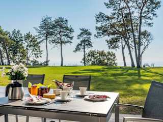 Die Unterkunft Terrassenwohnung "Usedom" - Oase am Haff bietet eine ansprechende Ferienwohnung mit Blick auf das Meer und einer großen Terrasse. Kostenfreies WLAN und Grillmöglichkeiten sind ebenfalls vorhanden. Zur Ausstattung gehören zudem Tischtennis, Dart und ein kostenloser Privatparkplatz. Ein Wellness-Bereich mit Fitnessraum und Sauna ist ebenfalls verfügbar. Die Mindestalter für den Check-in beträgt 18 Jahre, und Haustiere sind auf Anfrage erlaubt. Die Unterkunft ist in Nichtraucherzonen unterteilt.