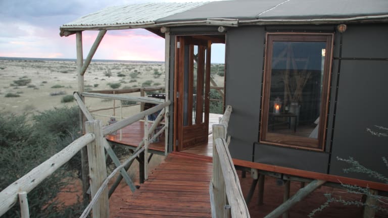 Die Teufelskrallen Lodge liegt am Rande eines 4.000 ha großen privaten Naturschutzgebiets, auf einer der westlichsten Kalahari-Dünen. Die 6 Zelthäuser auf Stelzen mit großer Aussichtsterrasse bieten einen atemberaubenden Ausblick in die beeindruckende Kalahari-Landschaft, von roten Dünen und Kameldornbäumen geprägt. Die Lage an der Kreuzung B1 / C21 garantiert eine hervorragende Erreichbarkeit - auch ohne allradgetriebenes Fahrzeug