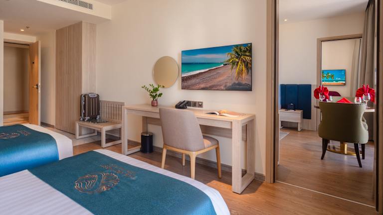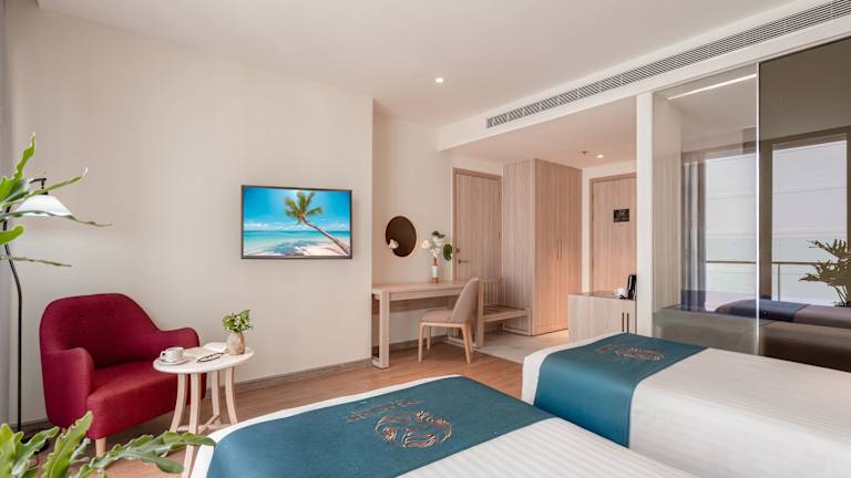 In den Zimmern sorgt eine Klimaanlage für ein behagliches Raumklima. Die meisten Zimmer verfügen über einen Balkon oder eine private Terrasse mit Meerblick. Zur Ausstattung gehören ein Doppelbett, ein Queensize-Bett, ein Kingsize-Bett oder ein Sofabett. Ein Safe, eine Minibar, ein Schreibtisch, eine Tee-/Kaffeemaschine sowie ein TV-Gerät mit Satellitenempfang sind ebenfalls vorhanden. Zudem bietet jedes Zimmer kostenfreies WLAN. Die Badezimmer sind mit einem Haartrockner und Bademänteln ausgestattet.