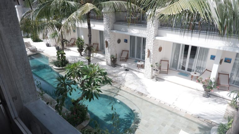 Das Hotel befindet sich auf der Insel Gili Trawangan, direkt am Strand mit Blick auf den Vulkan Rinjani und die Lombokstrasse. Die Anreise erfolgt in etwa zwei Stunden über Land und Wasser vom Flughafen Lombok.
