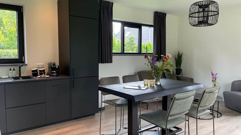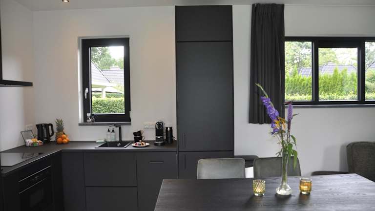 Der Black Oak - Luxe Bungalow mit privater Sauna bietet Ihnen eine komfortable Unterkunft in Voorthuizen. Hier können Sie einen entspannten Urlaub in einem Ferienhaus mit einem schönen Garten und einer Terrasse verbringen. Das Ferienhaus verfügt über 2 Schlafzimmer, eine gut ausgestattete Küche und ein komfortables Badezimmer. Genießen Sie die kostenfreien Privatparkplätze und das kostenlose WLAN. Entspannen Sie in der Sauna und erkunden Sie die Umgebung, die viele Sehenswürdigkeiten wie den Apenheul und das Paleis 't Loo bietet.