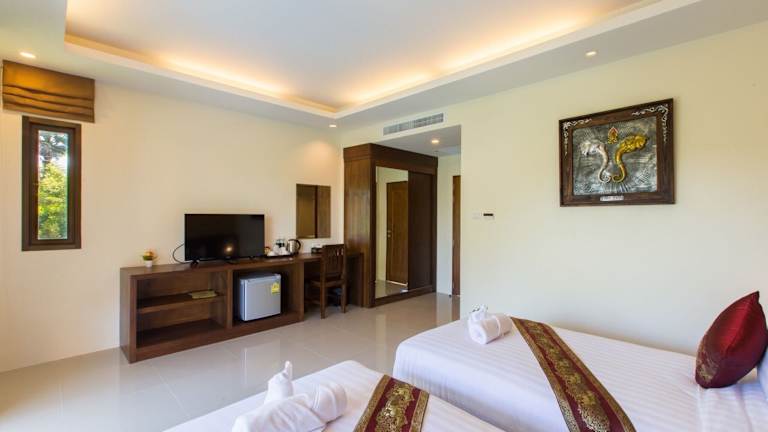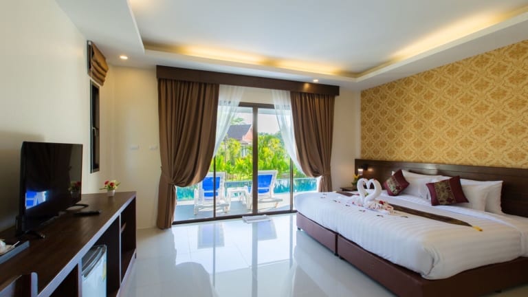 Die klimatisierten Zimmer sind mit einem Schreibtisch, einem Wasserkocher, einem Kühlschrank, einer Minibar, einem Safe, einem TV, einem Balkon und einem eigenen Badezimmer mit Dusche ausgestattet. Die Gäste können zudem den Blick auf den Pool geniessen.