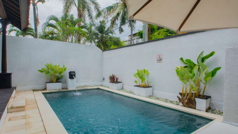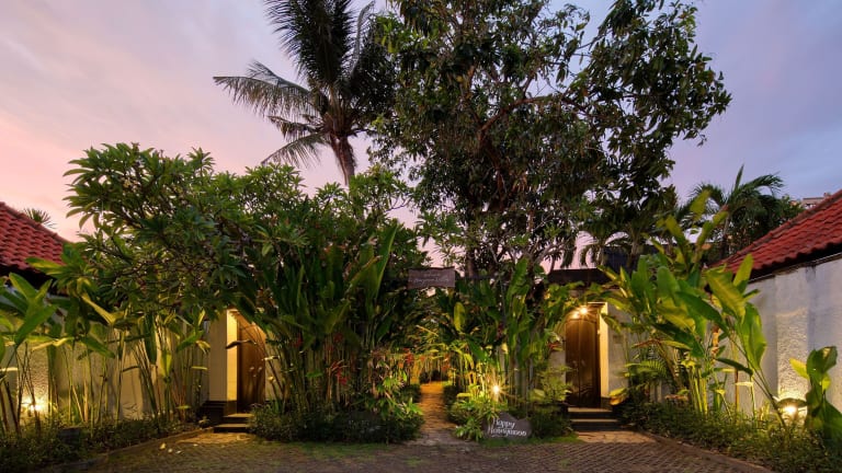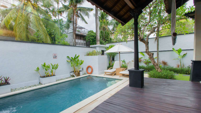 Das Resort befindet sich am Ende einer befestigten, schön gestalteten Strasse, in einer ruhigen Nebenstrasse der belebtesten Strassen in Seminyak. Beliebte Restaurants, Cafés und Bars sind in Fussgängerentfernung erreichbar. Der Strand Pettitenget Beach ist nur ca. 5 Fahrminuten entfernt, während der Flughafen in rund 30 Minuten zu erreichen ist.