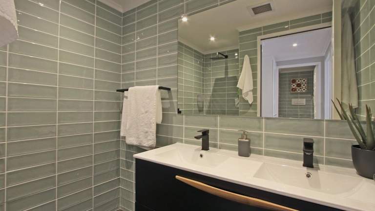 Die Ferienwohnung verfügt über zwei Schlafzimmer und ein Badezimmer, das mit Bettwäsche und Handtüchern ausgestattet ist. Zur Ausstattung gehören ein Flachbild-TV, ein Essbereich sowie eine voll ausgestattete Küche. Zudem gibt es eine Terrasse mit Meerblick.