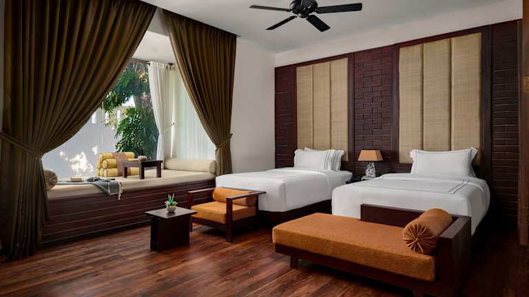 The Embassy Angkor Resort & Spa zeichnet sich durch eine Kombination aus traditioneller Khmer-Architektur und westlicher Effizienz aus. Das Resort bietet verschiedene Annehmlichkeiten, darunter ein Spa-Center und ein Fitness-Center. Die ausgedehnte Aussenpoolanlage und das Restaurant im Freien laden zum Verweilen ein.