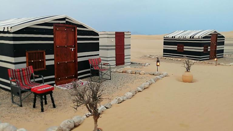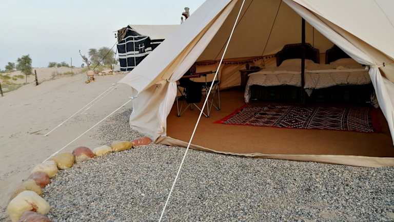 Legend Of Dunes - By Alreem Camp bietet gemütliche Übernachtungsmöglichkeiten in Form von Zelten mit Terrasse. Die Unterkunft erscheint als ideale Wahl für Gäste, die die Wüste authentisch erleben möchten.