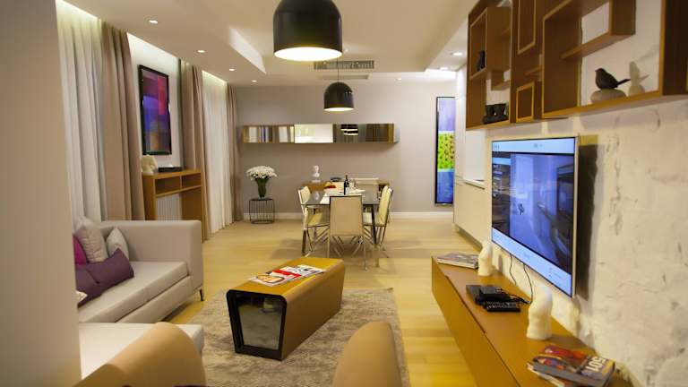 Die Zimmer sind klimatisiert und stilvoll gestaltet. Jedes Appartement umfasst ein Wohnzimmer, eine voll ausgestattete Küche mit Kochfeld, Geschirrspüler und Backofen sowie ein eigenes Bad mit Dusche und Haartrockner. In den Zimmern stehen ein 3D-Full HD-Smart-TV, ein interaktiver IP-TV mit Bluray-Player und WLAN zur Verfügung. Zustellbetten können angefordert werden, und es sind sowohl Familien- als auch Nichtraucherzimmer buchbar.