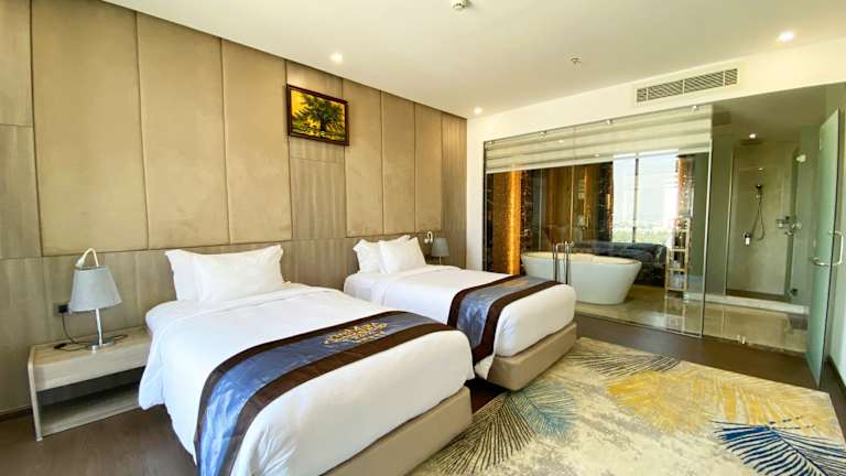 Die klimatisierten Zimmer verfügen über ein Doppelbett und ein Sofabett sowie ein eigenes Badezimmer mit Dusche und Badewanne. Viele Zimmer beinhalten einen Balkon oder eine Terrasse und sind mit einem Kühlschrank, einer Minibar, einem Wasserkocher und einem Flachbild-TV ausgestattet. Hausschuhe, ein Haartrockner, Bademäntel sowie Kosmetikartikel und eine Auswahl an Handtüchern zählen zur Ausstattung. Zudem werden Nichtraucher- und Raucherzimmer angeboten.