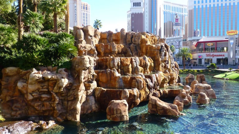 Das Hotel befindet sich zentral und lebhaft am „Strip“ von Las Vegas, nur ca. 5 km vom Flughafen Harry Reid International Airport entfernt. Die Lobby beeindruckt mit einem riesigen Aquarium und abends wird eine regelmässige Wasser-Show mit „Vulkanausbruch“ geboten.