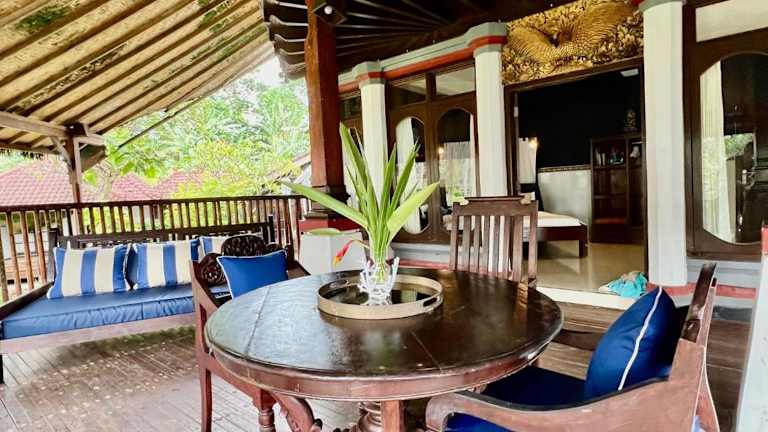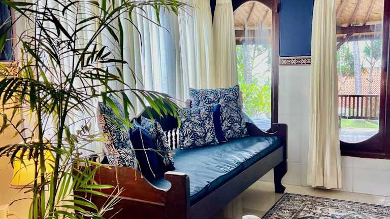 Die Zimmer der Seraya Shores Bali sind einladend und tropisch gestaltet. Sie verfügen über einen Sitzbereich mit Sofa, eine eigene Terrasse, die Ausblick auf das Meer und die Natur bietet, sowie ein halb offenes Bad mit kostenfreien Pflegeprodukten.