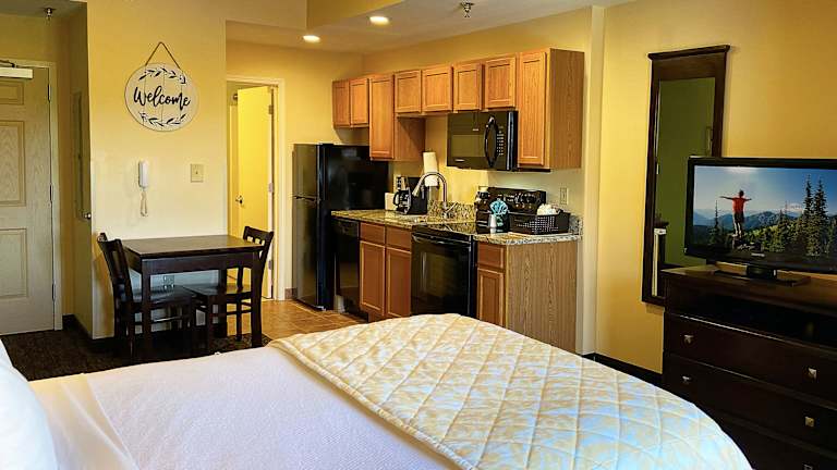 Die geräumigen Unterkünfte sind mit einer kompletten Küche ausgestattet. Jedes Zimmer verfügt über einen 55-Zoll Smart Screen TV und kostenfreies Wifi. Die meisten Einheiten bieten zusätzlich eine Waschmaschine und einen Trockner. Es werden auch Babybetten zur Verfügung gestellt.