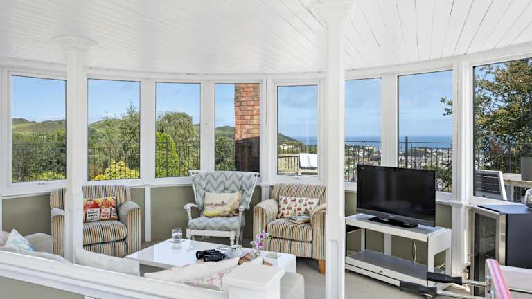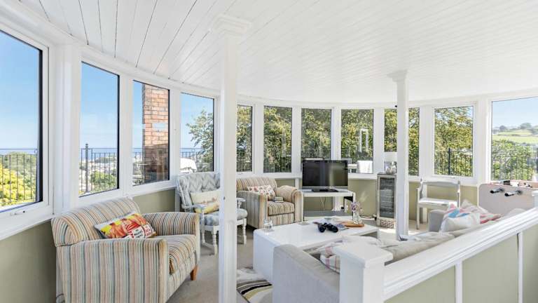 The Round House - Panoramic views of Devon's Coast and Country bietet ein heimeliges Ferienhaus mitten in der Natur. Ausgestattet mit fünf Schlafzimmern und vier Badezimmern, eignet sich die Unterkunft ideal für Familien oder Gruppen. Die Gäste können die Terrasse mit Meerblick und den gepflegten Garten geniessen.