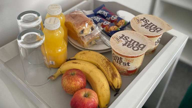 Das Frühstück kann im Zimmer serviert werden. Es besteht die Möglichkeit, Speisen für spezielle Ernährungsbedürfnisse auf Anfrage zu erhalten. Eine Bar ist ebenfalls vorhanden, wo Gäste Getränke und möglicherweise kleinere Snacks geniessen können.