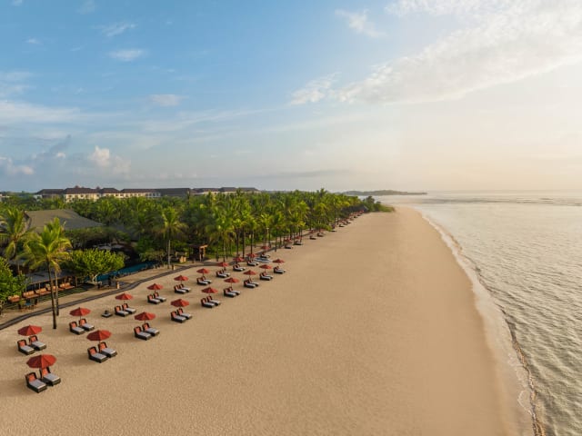 The St. Regis Bali Resort is nestled on the serene and spectacular Nusa Dua beach with its golden sands stretching on seemingly endlessly. The island home’s profoundly special beauty, creativity and spirituality are proudly celebrated at the luxury beach resort. You’ll feel it from the moment you enter the lobby, where a musician strums a traditional rindik - a staple at Balinese celebrations. Those are evident each evening when a dramatic fire dance performance takes place at sundown by the Grand Staircase. Our Nusa Dua, Bali, hotel's spacious rooms, suites and villas include outdoor space and provide garden, pool or beachfront views – with Villas and Residences with direct access to the beach. Your exquisite stay is coupled with renowned culinary offerings that include the best breakfast buffet in Bali: such as Lobster Omelet and Wagyu Steak and Eggs alongside your regular favorites. You can be assured your every need is in the care of the signature 24-hour butler service to assist with any request.