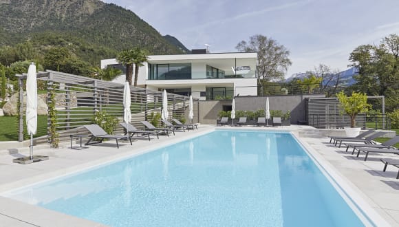 the view - your private luxury suites ist eine exklusive Anlage, gelegen inmitten der Natur, umgeben von Obstgärten und Weinreben, auf einer Anhöhe nahe Meran und trotzdem zentrumsnah. Ein Logenplatz für Geniesser, welche das Aussergewöhnliche suchen und auf Privatsphäre, Grosszügigkeit und Erholung sehr viel Wert legen. the view besticht durch schlichte Eleganz, klares Design und luxuriöse Wohnfühlatmosphäre in allerbester Lage. Alle Suiten sind nach Süden mit Blick auf das Meraner Land ausgerichtet und verfügen über großflächige Terrassen und zum Teil Privatgärten. Die rahmenlosen Fensterfronten aus Glas kombiniert mit hochwertigen Materialien sorgen dabei für ein offenens Raumgefühl mit einzigartigem Wohnerlebnis. Die Übergänge zwischen Innen- und Aussenbereich verschwinden. Der Salzwasser Infinitypool mit Panoramablick auf die umliegende Bergwelt rundet das Gefühl von Freiheit ab. Insgesamt eine Lifestyle Residenz, die höchsten Erwartungen entspricht und ihren Urlaub zu etwas Besonderen macht.