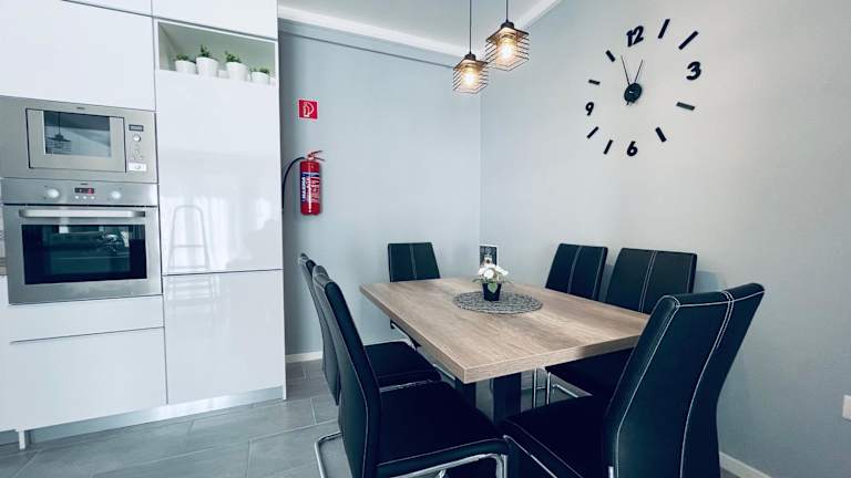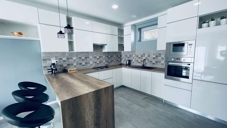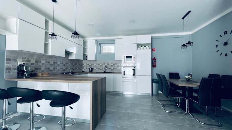 Die Ferienwohnung verfügt über eine voll ausgestattete Küche mit Kühlschrank und Kaffeemaschine. Es gibt auch Optionen für Lebensmittellieferungen, ebenfalls gegen zusätzliche Gebühren.