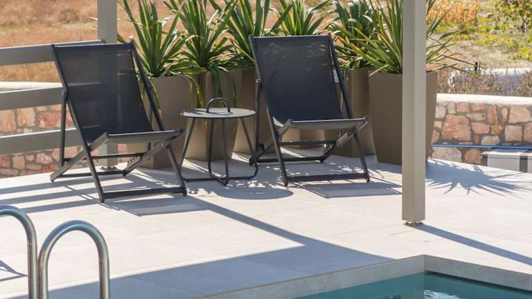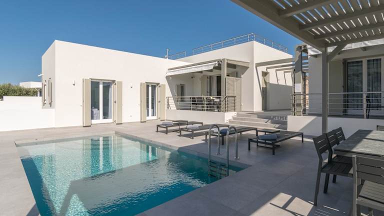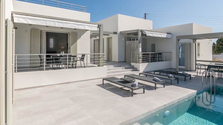 Die Zimmer der Thiopetra Villas sind komfortabel ausgestattet und verfügen über eine Terrasse mit Stadtblick, einen Sitzbereich, einen Flachbild-TV sowie eine voll ausgestattete Küche mit Kühlschrank und Geschirrspüler. Jedes Zimmer bietet ein eigenes Badezimmer mit Dusche und Haartrockner, sowie ein zusätzliches, voll ausgestattetes Badezimmer mit Badewanne und Hausschuhen.
