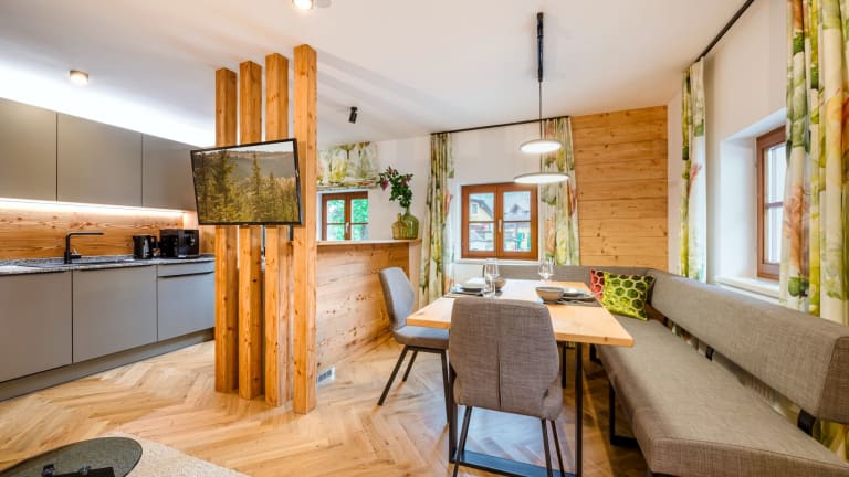 Thorbäck Gut - Apartments in Öblarn In unserem Schlosserhaus, einem Gebäude der Thorbäck Gut Apartments, erwarten Sie Ferienwohnungen der Extraklasse! Natürliche Materialien, viel Holz und eine stilvolle Auswahl edler Stoffe, Farben und Muster schaffen eine perfekte Balance zwischen stylischem Flair und behaglicher Gemütlichkeit. Und das Beste: In jedem Apartment wartet Ihre ganz private Sauna auf Sie - perfekt zur Entspannung nach einem ereignisreichen Urlaubstag! Die Schlosserhaus Apartments sind nicht nur eine Unterkunft, sondern die ideale Home Base für Natur, Kultur, Sport und Halli-Galli. Öblarn liegt im ruhigen Unterland der Top-Urlaubsregion Schladming-Dachstein, zwischen Naturpark Sölktäler und Nationalpark Gesäuse sowie am Eingang zum Ausseerland-Salzkammergut. In unserem historischen Schlosserhaus im Ortszentrum erleben Sie die Kultur, Wurzeln und Traditionen der Region hautnah und können sich auf Slow Travel einlassen. Unser Ziel ist es, Ihnen ein unvergessliches Urlaubserlebnis zu bieten, das Sie lange in Erinnerung behalten werden. Lassen Sie sich von der Schönheit der Steirischen Bergwelt verzaubern und gönnen Sie sich eine Auszeit im Schlosserhaus. Wir freuen uns auf Ihren Besuch!