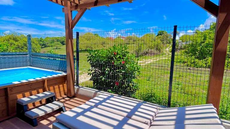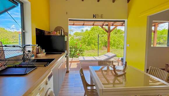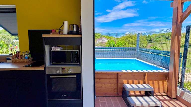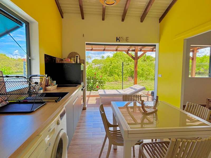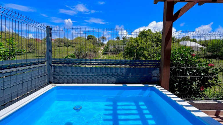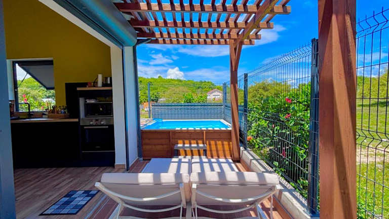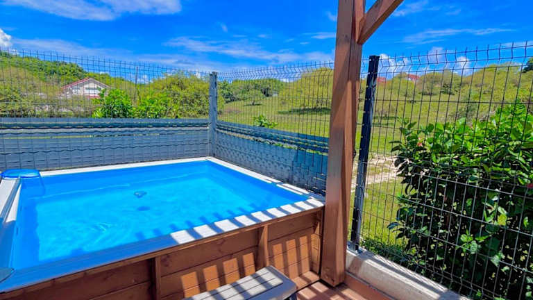 Ti-Kaz Gwada bietet eine klimatisierte Unterkunft mit einem Außenpool und einem eigenen Strandbereich. Das Ferienhaus verfügt über zwei Schlafzimmer, ein Badezimmer, eine Terrasse mit Gartenblick sowie eine voll ausgestattete Küche.
