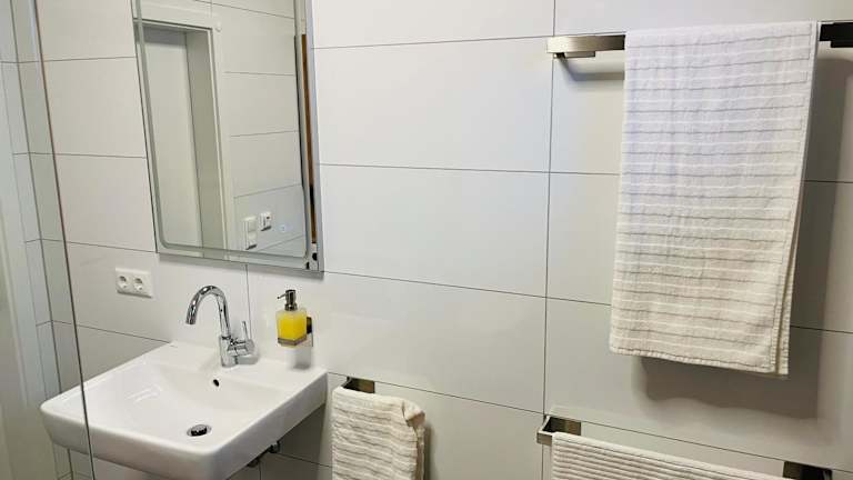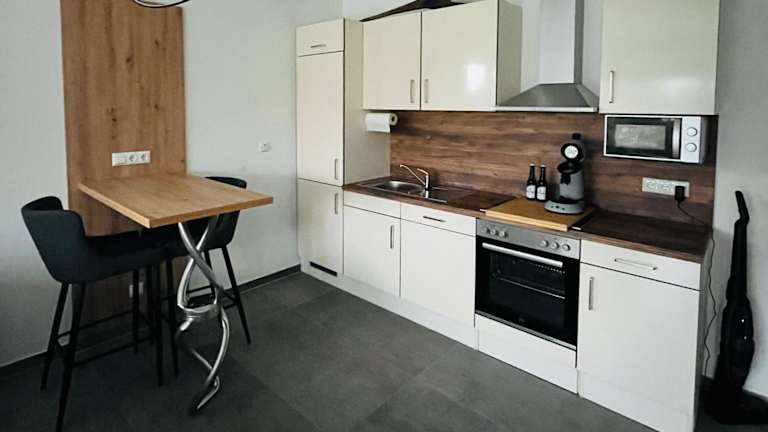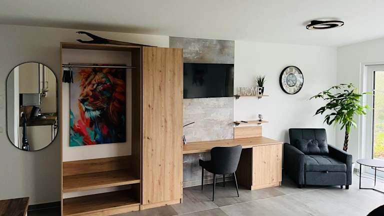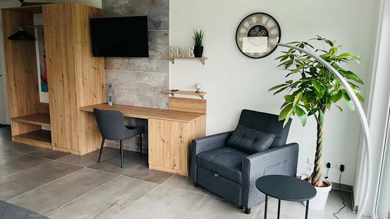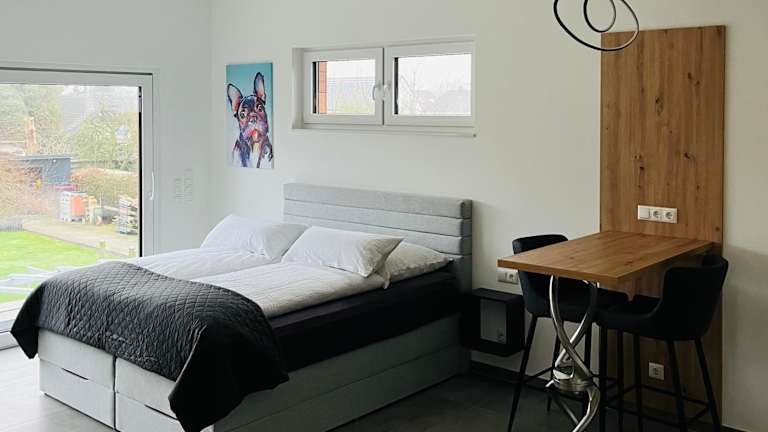 Das Apartment verfügt über ein Schlafzimmer, ein Badezimmer, sowie über Bettwäsche und Handtücher. Ein Flachbild-TV und eine voll ausgestattete Küche sind ebenfalls vorhanden. Zudem gibt es einen Balkon mit Blick auf den Garten.