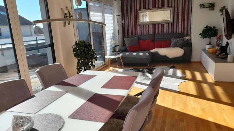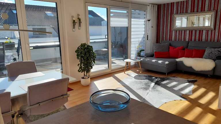 Die Unterkunft Tina's Lounge Penthousewohnung befindet sich in Friedrichshafen, in einer Gegend, die reich an Möglichkeiten zum Wandern und Velofahren ist. Die Messe Friedrichshafen liegt 10 km entfernt und der Flughafen Friedrichshafen ist 8 km entfernt. Die Umgebung bietet zudem abwechslungsreiche Freizeitmöglichkeiten.