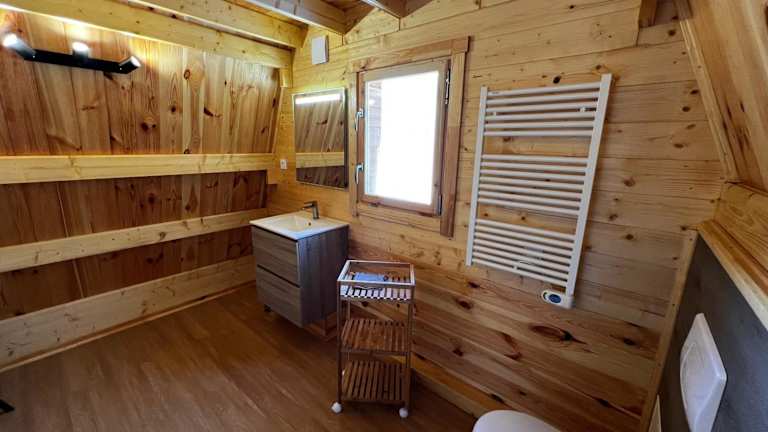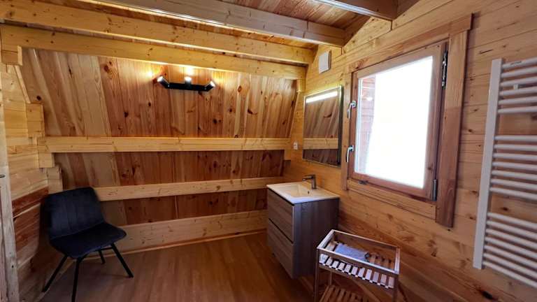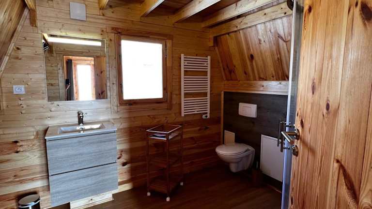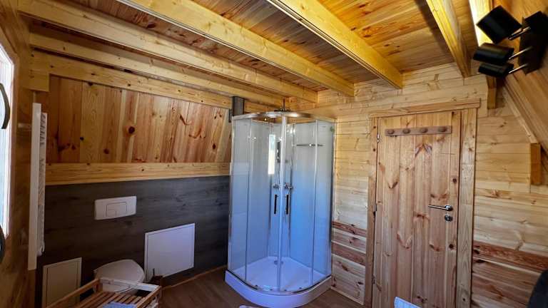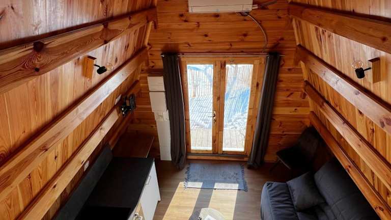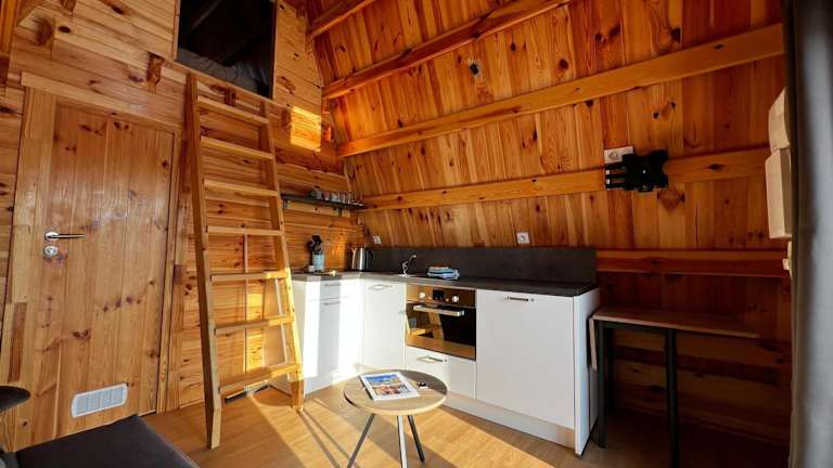 Das Chalet beinhaltet ein Schlafzimmer sowie ein gemütliches Wohnzimmer. Die voll ausgestattete Küche verfügt über einen Kühlschrank und eine Kaffeemaschine. Das Badezimmer ist mit einer Dusche ausgestattet, und ein Flachbild-TV sorgt für zusätzliche Unterhaltung. Die Klimaanlage gewährleistet eine angenehme Bequemlichkeit.