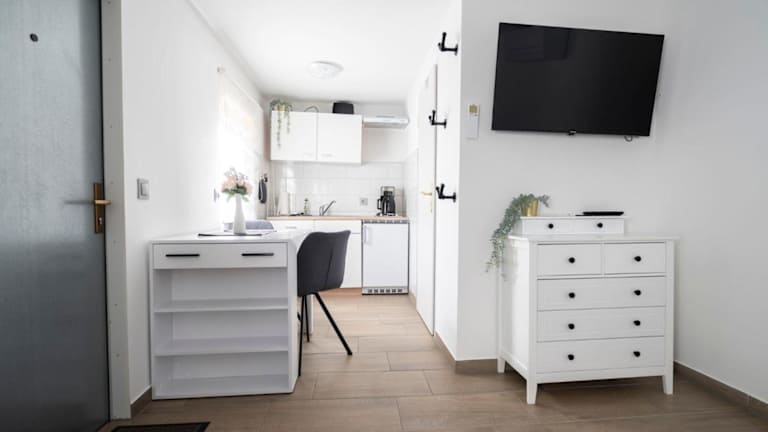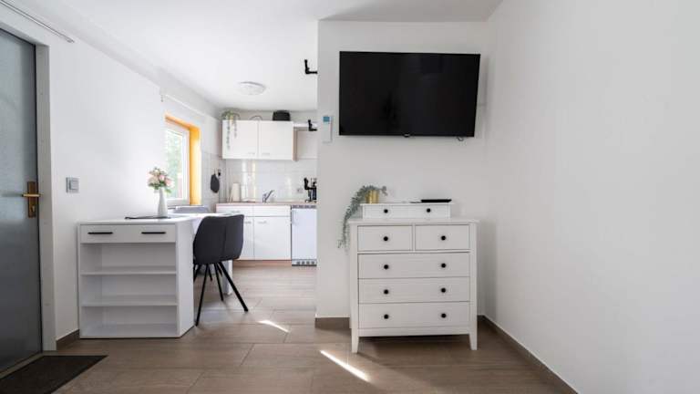 Die Ferienwohnung besteht aus 1 Schlafzimmer, einem Wohnzimmer sowie einer voll ausgestatteten Küchenzeile mit Kühlschrank und Kaffeemaschine. Das Badezimmer verfügt über eine Dusche und einen Haartrockner. Handtücher und Bettwäsche werden zur Verfügung gestellt.
