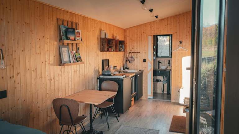 Das Tiny House umfasst ein Schlafzimmer, ein Wohnzimmer sowie ein Badezimmer mit Dusche. Zudem ist die Unterkunft mit einer Küche ausgestattet, die die Zubereitung eigener Mahlzeiten ermöglicht. Eine kostenlose Internetverbindung (Wifi) steht im gesamten Bereich zur Verfügung.