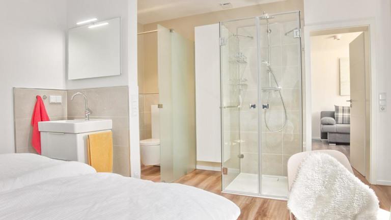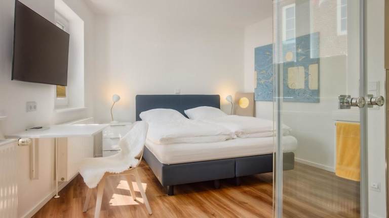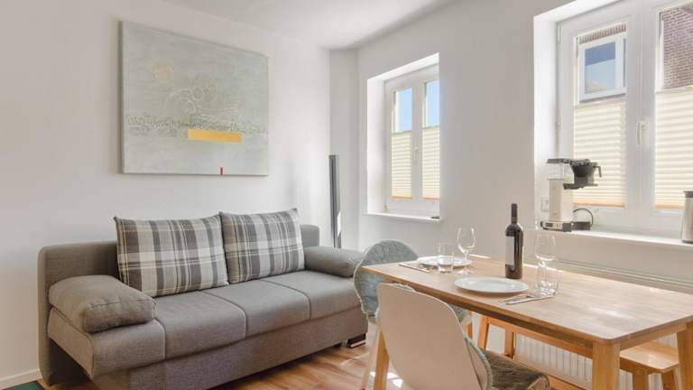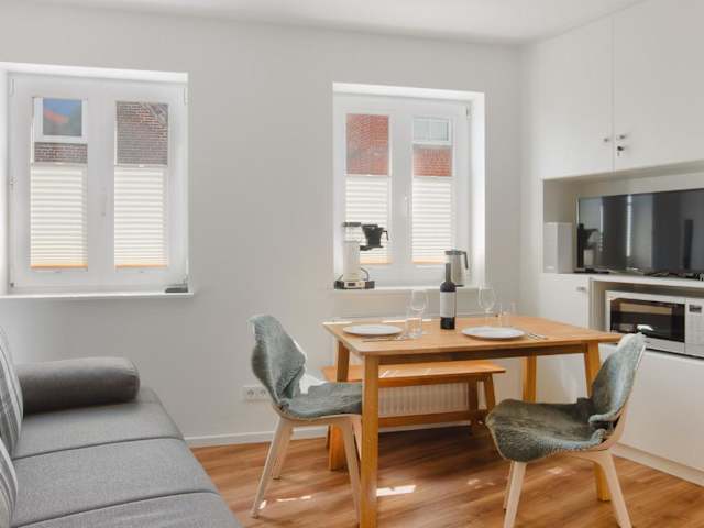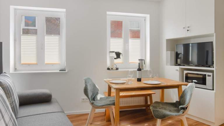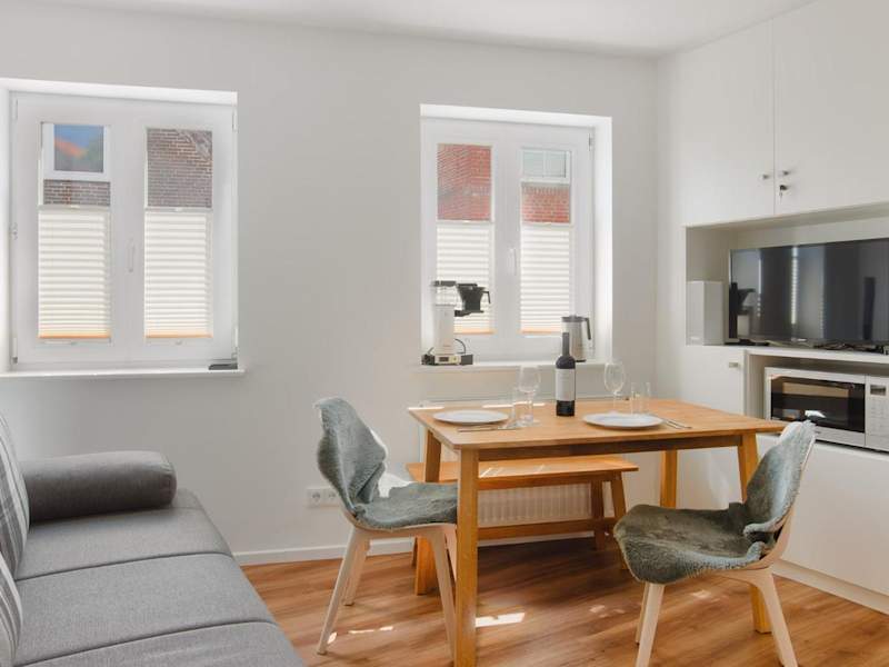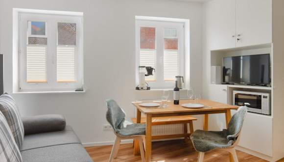 Die Ferienwohnung besteht aus einem Schlafzimmer, einem Wohnzimmer und einem Badezimmer mit Dusche. Eine voll ausgestattete Küchenzeile mit Kühlschrank und Kaffeemaschine bietet zusätzliche Bequemlichkeit. Handtücher und Bettwäsche können gegen Aufpreis zur Verfügung gestellt werden.
