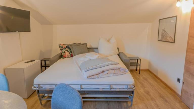 Die Ferienwohnung umfasst ein Schlafzimmer, ein Wohnzimmer und eine gut ausgestattete Küche mit Kühlschrank und Geschirrspüler. Handtücher und Bettwäsche werden bereitgestellt. Zudem steht eine Terrasse zur Verfügung.