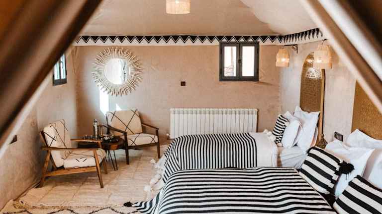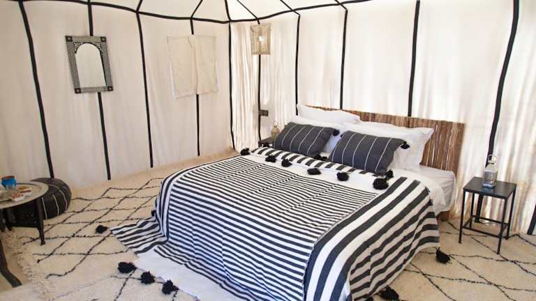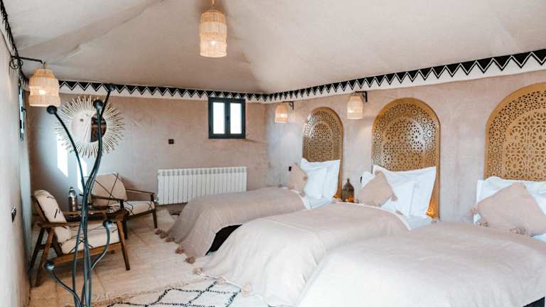 Die Unterkünfte im Tiziri Camp bieten Ihnen den Komfort und die Gemütlichkeit, die Sie für einen erholsamen Aufenthalt in der Wüste benötigen. Jede Unterkunft verfügt über kostenfreies WLAN und eine Terrasse, von der aus Sie einen spektakulären Blick auf die Sanddünen genießen können. Hier können Sie den Sonnenaufgang oder den Sonnenuntergang bewundern und die Ruhe der Wüste in vollen Zügen genießen.