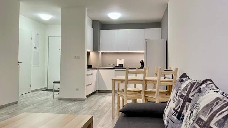 Die Ferienwohnung besteht aus einem Schlafzimmer, einem Wohnzimmer und einer voll ausgestatteten Küche, die mit einem Kühlschrank und einer Kaffeemaschine ausgestattet ist. Das Badezimmer ist mit einer Badewanne und kostenlosen Pflegeprodukten versehen. Handtücher und Bettwäsche werden bereitgestellt.