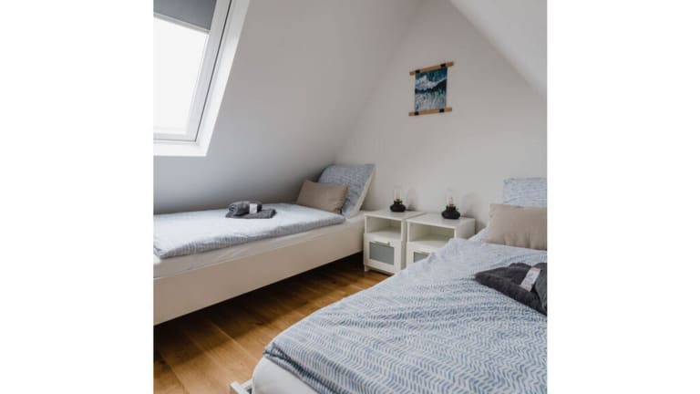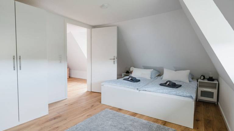 Die Ferienwohnung bietet zwei Schlafzimmer, ein Wohnzimmer und eine voll ausgestattete Küche mit Kühlschrank und Essbereich. Handtücher und Bettwäsche werden bereitgestellt.