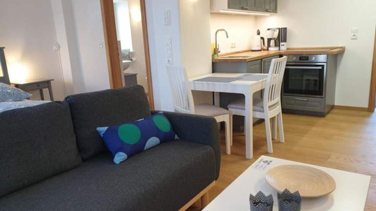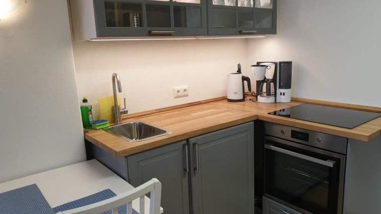 Die Ferienwohnung verfügt über eine gut ausgestattete Küchenzeile mit Kühlschrank, Ofen, Herdplatte, Kaffeemaschine und Wasserkocher, sodass Gäste ihre eigenen Mahlzeiten zubereiten können.