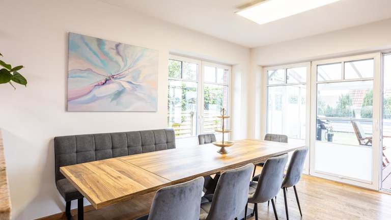 Die Ferienwohnung bietet Platz in fünf Schlafzimmern sowie einem Wohnzimmer. Ausgestattet ist die Unterkunft mit einem Flachbild-TV und einer gut eingerichteten Küche, die über einen Kühlschrank und einen Geschirrspüler verfügt. Zur Ausstattung gehören zudem drei Badezimmer mit einer Dusche. Handtücher und Bettwäsche werden bereitgestellt. Die Wohnung verfügt über eine Terrasse mit Gartenblick.