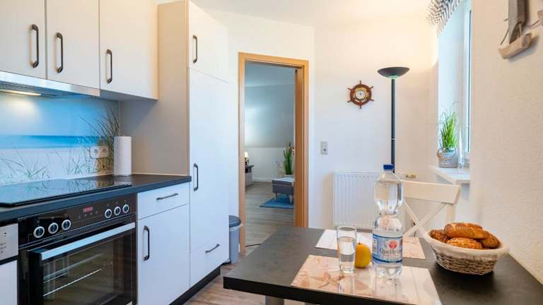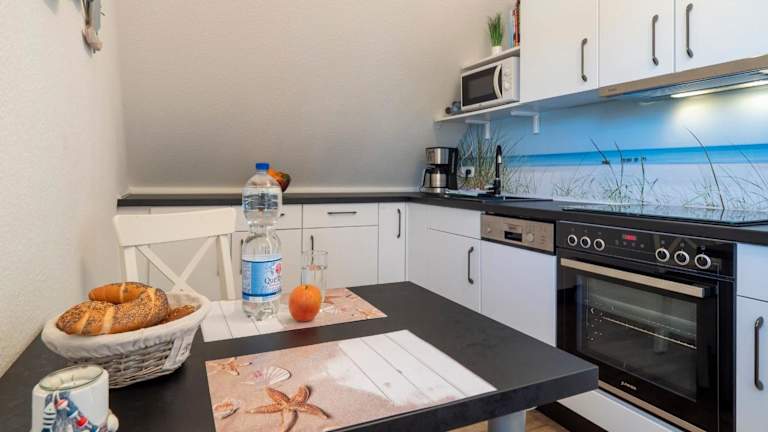 Die Ferienwohnung ist mit einer eigenen Küche ausgestattet, die einen Kühlschrank, Geschirrspüler und Kaffeemaschine beinhaltet. Damit können Gäste nach Belieben eigene Mahlzeiten zubereiten und geniessen.