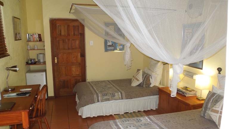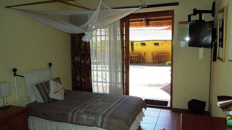 Trees Too is a small, private and intimate owner run guest-house. Its eight bedrooms of varying size and format offer individualistic accommodation in our home. The centrepiece is a swimming pool surrounded by sub-tropical gardens. Dining is available from our small restaurant with most seating outdoors and overlooking the pool. We are situated in the quiet village of Komatipoort, just ten minutes from the Crocodile Bridge gate of the Kruger National Park and Ressano Garcia border with Mozambique. Children are welcome if accompanied by responsible adults. We offer a self-service (honesty) bar for harassed parents and free Wi-Fi for fretful teenagers.