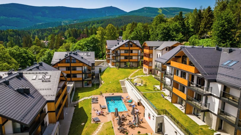 Direkt an den nördlichen Ausläufern des polnischen Karkonoski Park Narodowy gelegen, bietet das Resort den idealen Ausgangspunkt für ausgedehnte Wandertouren, Skifahren und Biken. Die ruhige Lage am Ortsrand ermöglicht es, die Natur in vollen Zügen zu geniessen. Das Stadtzentrum von Karpacz ist ca. 1 km entfernt und ist in etwa 15 Minuten zu Fuss zu erreichen.