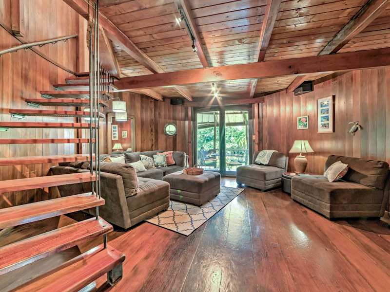 Tropical Cabana with Deck, Hot Tub and Lush Scenery! bietet Übernachtungsmöglichkeiten mit Annehmlichkeiten wie kostenlosem Wifi und einem Flachbild-TV. Die Unterkunft verfügt über einen Wellness-Bereich mit einem Whirlpool und ist von üppiger Natur umgeben.
