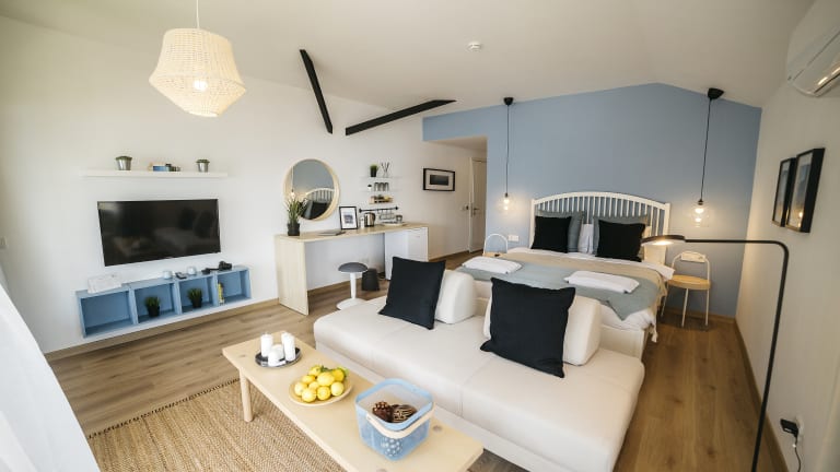 Das Hotel hat Suiten verfügen über ein Wohnzimmer mit Schlafsofa für Familien mit einem Kind. Sie haben auch Dachzimmer mit Meerblick und romantische Zimmer mit Terrasse, auch das Studio mit Gartenterrasse und das Steinhausstudio, und Für große Familien und Gruppen von Freunden gibt es Zimmer mit zwei Schlafzimmern und 2 Villen von 200 m², Whirlpool, Steinmauern, 4 Schlafzimmer und große Terrassen die Möglichkeit gibt für eine komfortable und lange Urlaubsmöglichkeiten.