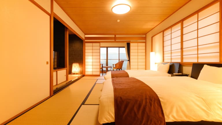Die Zimmer in der Unterkunft Tsumugi sind mit einem Balkon ausgestattet und bieten den Gästen Bequemlichkeit durch Klimaanlage, einen Safe und einen Flachbild-TV.