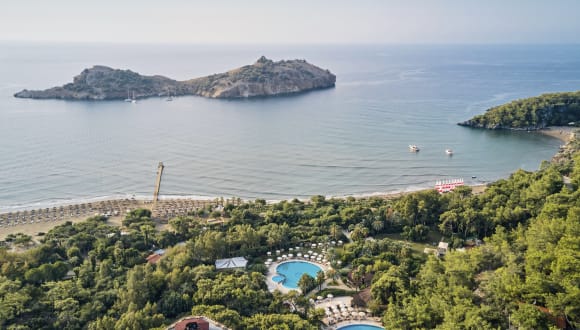In einer wunderschönen geschützten Bucht direkt am kilometerlangen, flach abfallenden Sandstrand gelegen. Malerisch zwischen Pinienwäldern und dem Taurusgebirge im Hinterland. Der kleine Ort Sarigerme ist ca. 1 km entfernt.