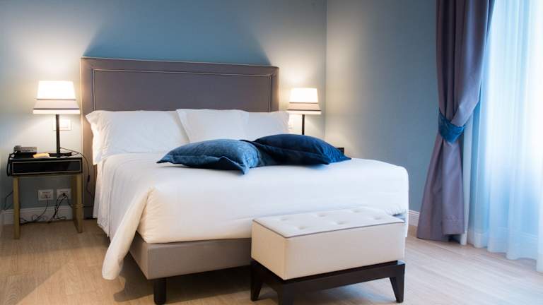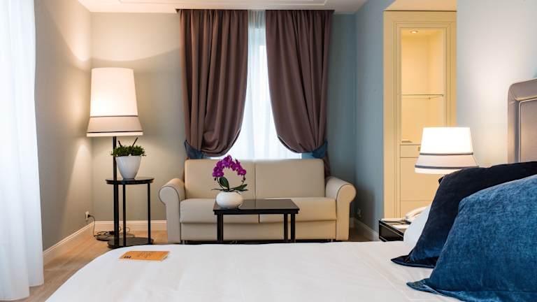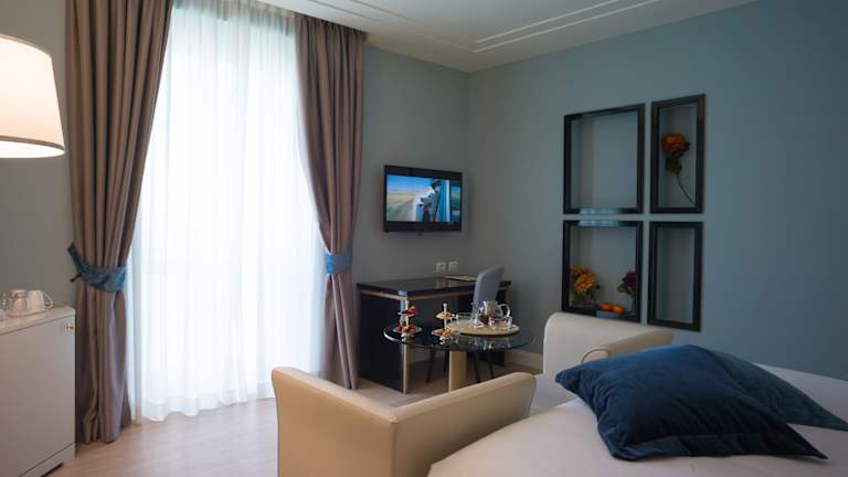 Die klimatisierten Zimmer sind in warmen Pastellfarben gehalten und verfügen über Holzdielen, ein Kingsizebett, ein Sofabett, einen Kühlschrank sowie eine Tee-/Kaffeemaschine. Zu den weiteren Annehmlichkeiten zählen ein TV-Gerät mit Satellitenempfang, eine Minibar (mit kostenfreien Getränken), ein Safe, ein Schreibtisch und ein Telefon mit Direktwahl. Die Badezimmer sind mit Dusche und Badewanne ausgestattet, bieten Bademäntel, Hausschuhe und Kosmetikartikel. Es stehen auch rollstuhlgerechte Zimmer zur Verfügung.