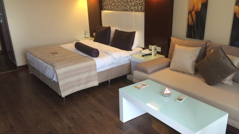 Geschmackvoll möblierte 268 Zimmer mit Meerblick und 68 Zimmer mit Blick in den Garten, auf das ägäischen Meer oder die westliche Hügellandschaft. Zimmer mit meer oder Gartenblick: Die Zimmer sind ca. 28 qm groß und egal, ob mit Blick auf das Meer oder in den Garten besitzen alle eine Klimaanlage, Sateliten-TV, eine Minibar, Bad, Fön, Telefon, Geldtresor. Auf Wunsch kann auch ein Kinderbett fürs Baby bereitgestellt werden.