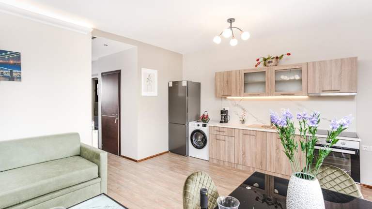 Die Maisonette umfasst zwei Schlafzimmer, ein Wohnzimmer und eine gut ausgestattete Küche mit Kühlschrank und Kaffeemaschine. Beide Badezimmer sind mit Dusche und Haartrockner ausgestattet. Handtücher und Bettwäsche werden zur Verfügung gestellt.
