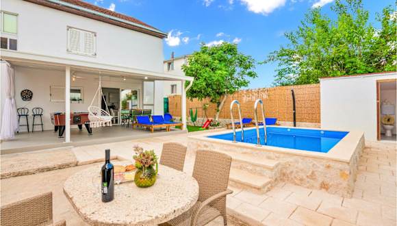 Die Ferienwohnung bietet Übernachtungsmöglichkeiten mit einem eigenen Pool und einer Sonnenterrasse. Sie ist klimatisiert und umfasst zwei Schlafzimmer sowie ein Wohnzimmer. Die Unterkunft bietet zudem Zugang zu einem Aussenpool.
