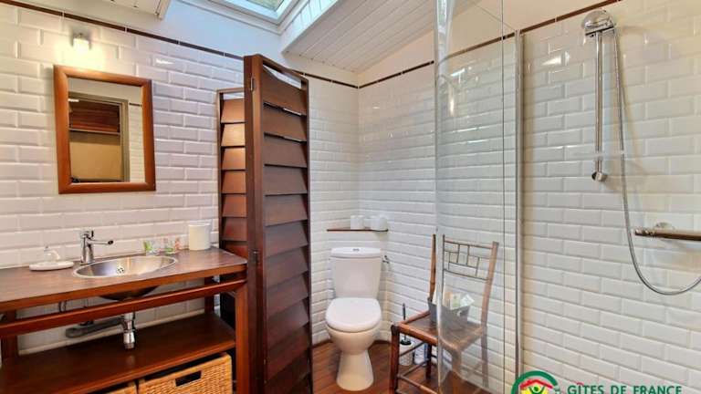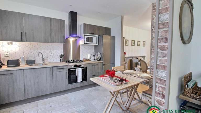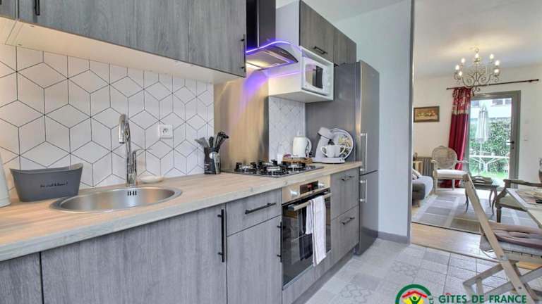 Das Ferienhaus umfasst ein Schlafzimmer, eine Küche, die mit einem Kühlschrank und einem Geschirrspüler ausgestattet ist, sowie einen TV und einen Sitzbereich. Das Badezimmer ist mit einer Dusche versehen.