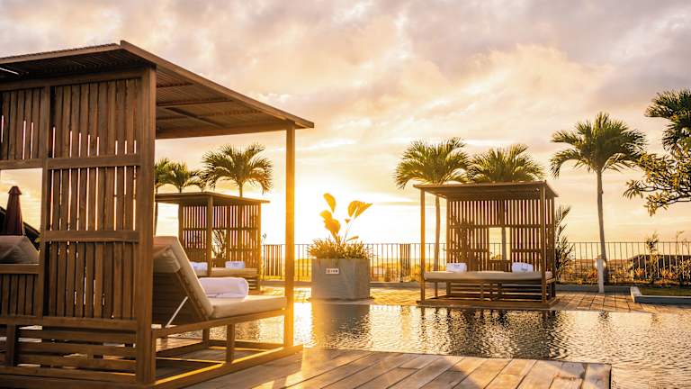 Die Suiten sind mit einem Balkon oder einer Terrasse ausgestattet und bieten einen Kingsize-Bett, Klimaanlage, Safe, Minibar und Kühlschrank. Das offene Badezimmer hat sowohl eine Dusche als auch eine Badewanne, dabei stehen Haartrockner und Bademäntel zur Verfügung. Zudem bieten die Zimmer WLAN, einen Fernseher mit Satellitenempfang und eine Tee-/Kaffeemaschine.