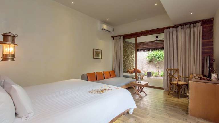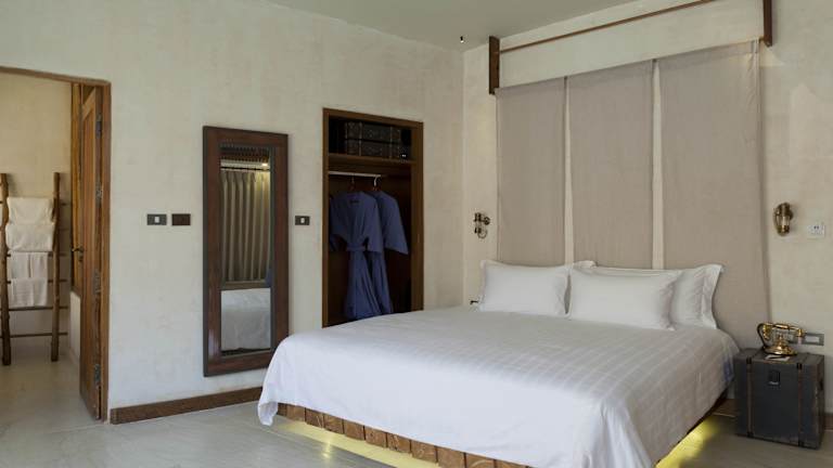 Die Zimmer sind ausgestattet mit Klimaanlage, Balkon oder Terrasse, Badezimmer mit Dusche und Whirlwanne sowie modernen Annehmlichkeiten wie Minibar, Safe und Sat-TV. Einige Villen verfügen über einen eigenen Pool und Meerblick. Auch Familienzimmer sind verfügbar.